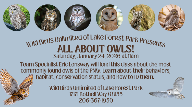 January is unofficially Owl Month! Join us as Team Specialist teaches us about the most common owls found in the PNW. You'll learn about their habitats, behaviors, conservation status, and how to ID them.