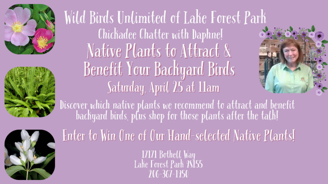 Before you plan that spring garden, let us help you choose the right native plants to attract and benefit your backyard birds! Team Specialist Daphne has been a featured speaker at the annual Northwest Flower & Garden Show and shares her expertise and advice with you. After the talk, shop our hand-curated selection of native plants! Attendees may enter to win a native plant from our selection.